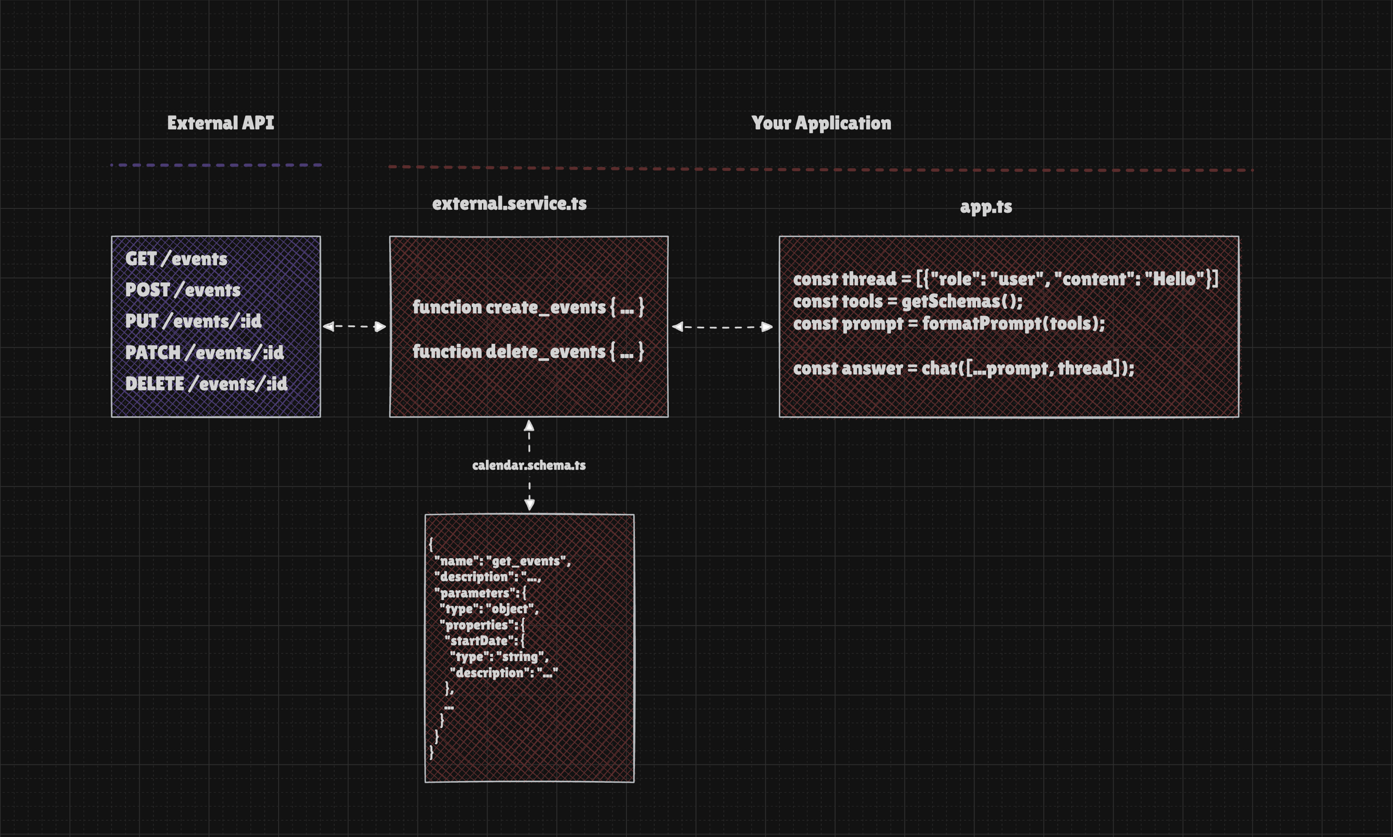 Below is a simple schema illustrating the logic required to connect to an external API using Function Calling, which is a feature of the LLM API. Function Calling requires us to define a JSON Schema that describes the available actions, as well as the actual executor functions that will be triggered when the LLM decides to use a given tool.