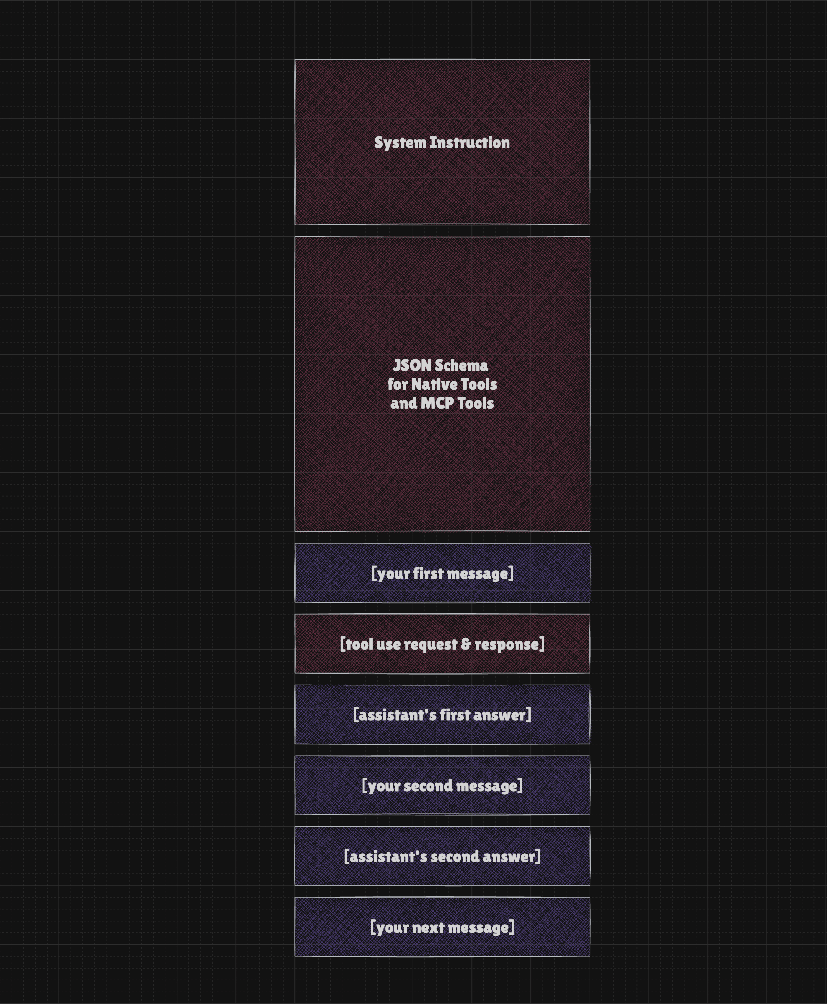 Let's say we have a simple chatbot that can access the MCP Server, allowing it to interact with the browser. Every time we send a message, the LLM sees something like this: