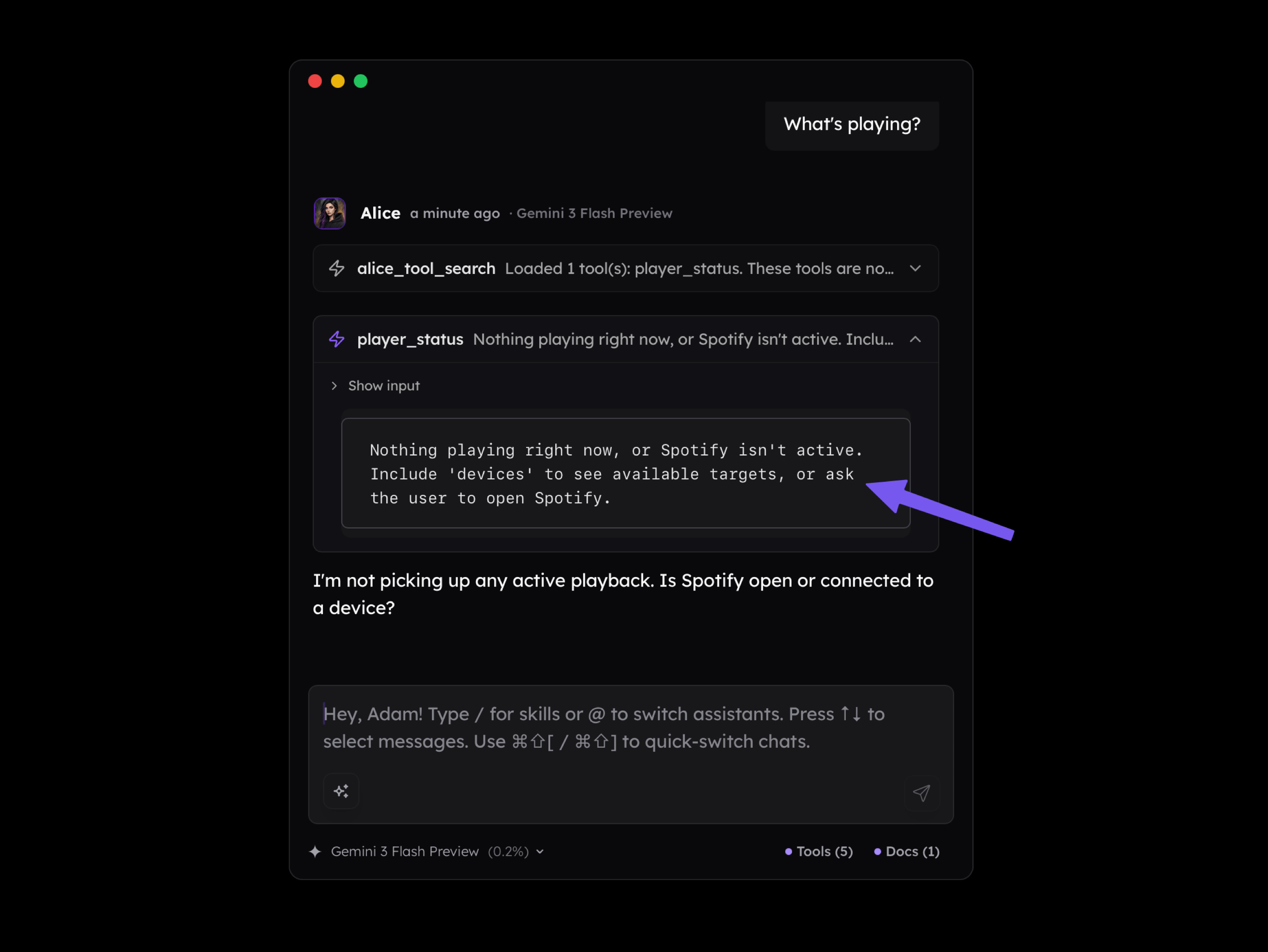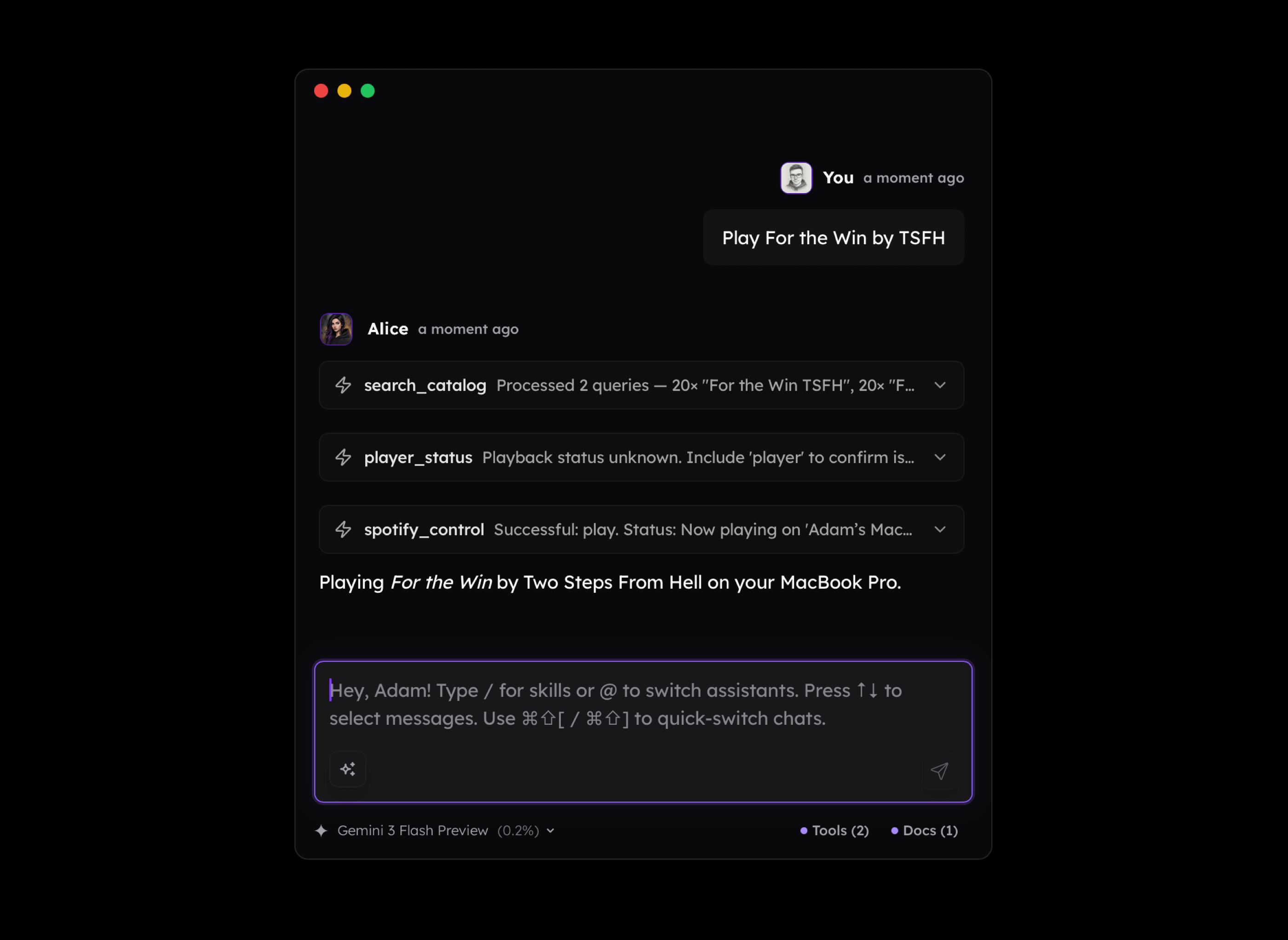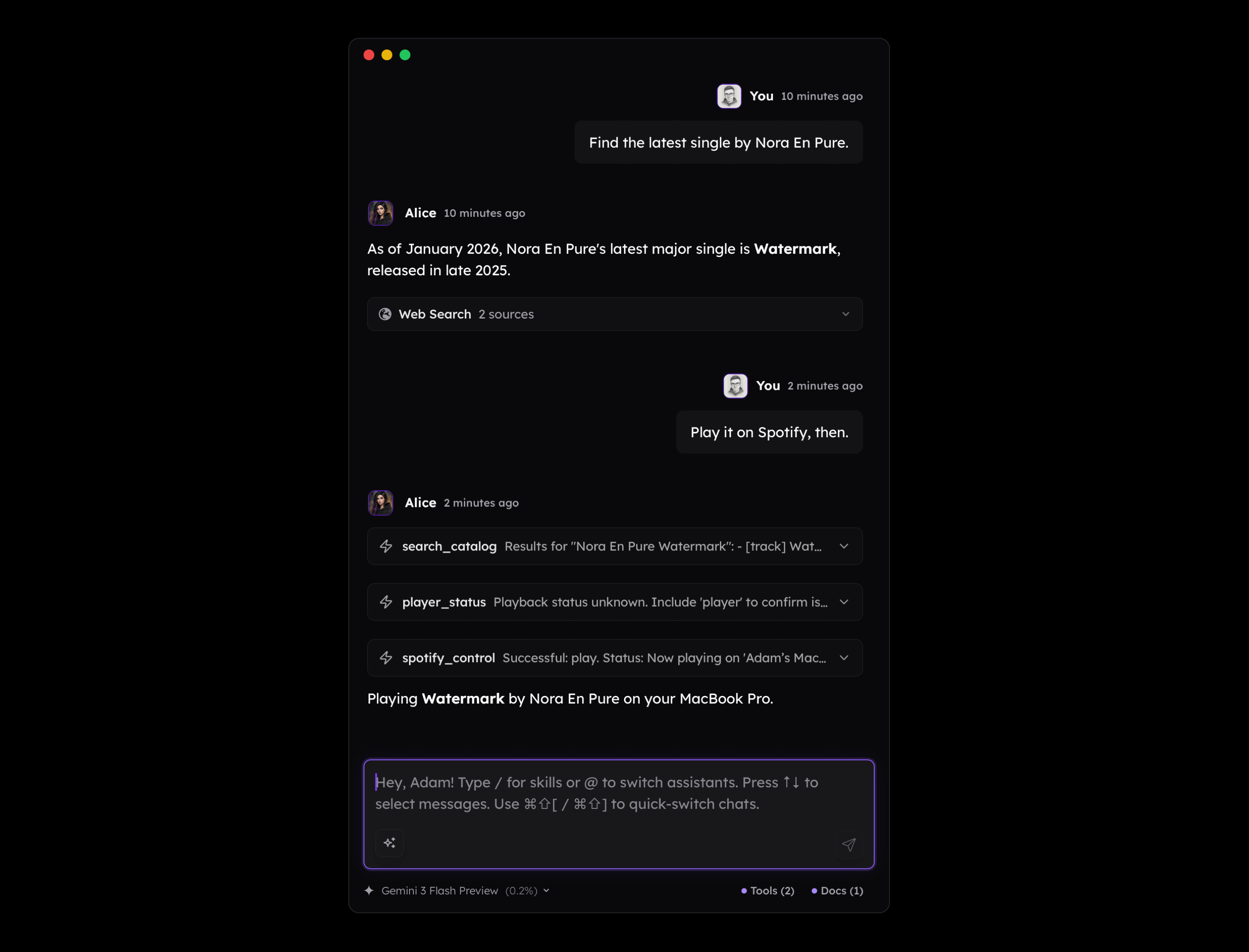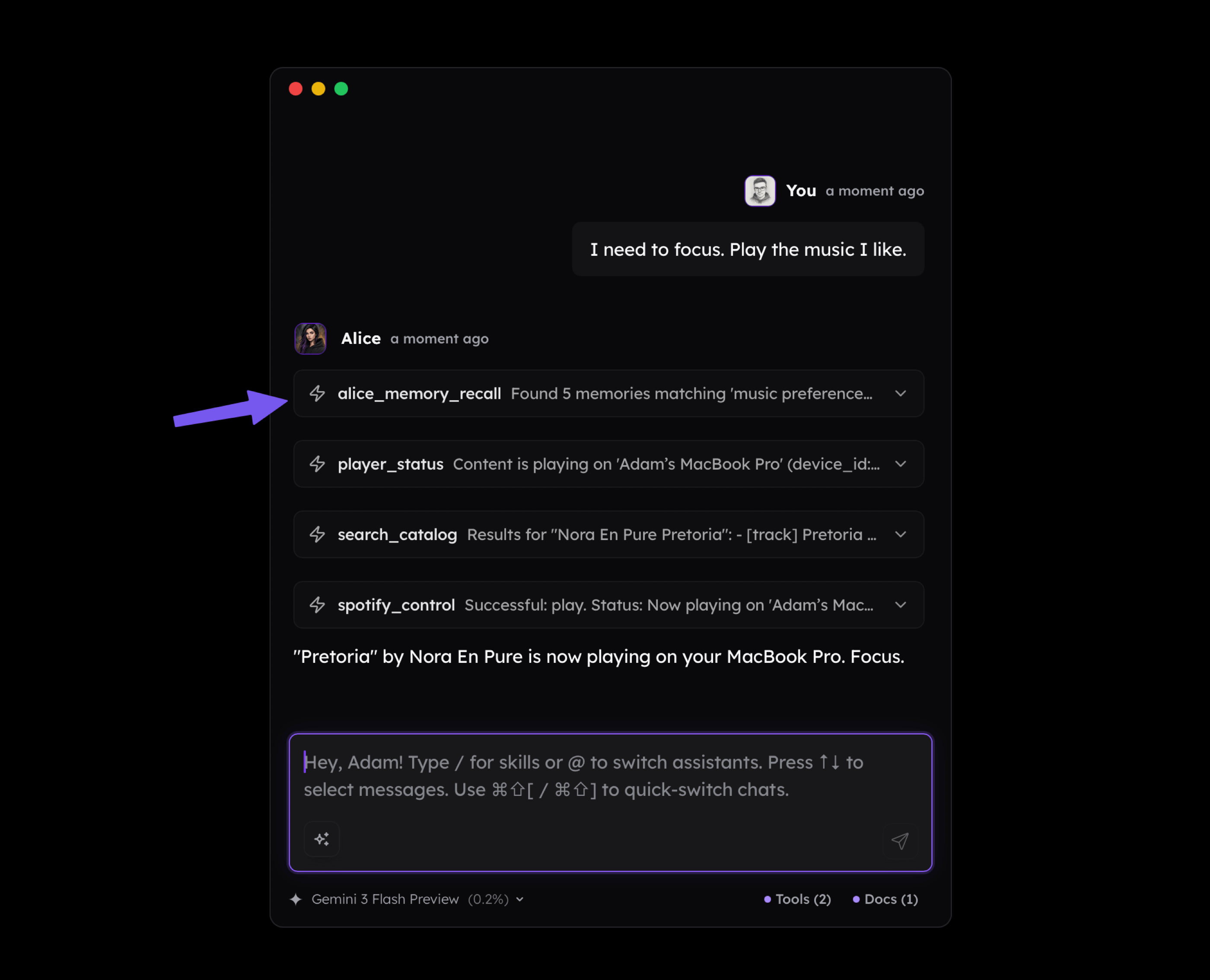 Suddenly, the model can do things such as connecting the dots between our activities, current environment, and external knowledge and be able to play music we mentioned before that helps us focus. As you see below, I didn't mention Nora En Pure in my message, but the long-term memory available to the assistant made it play it.