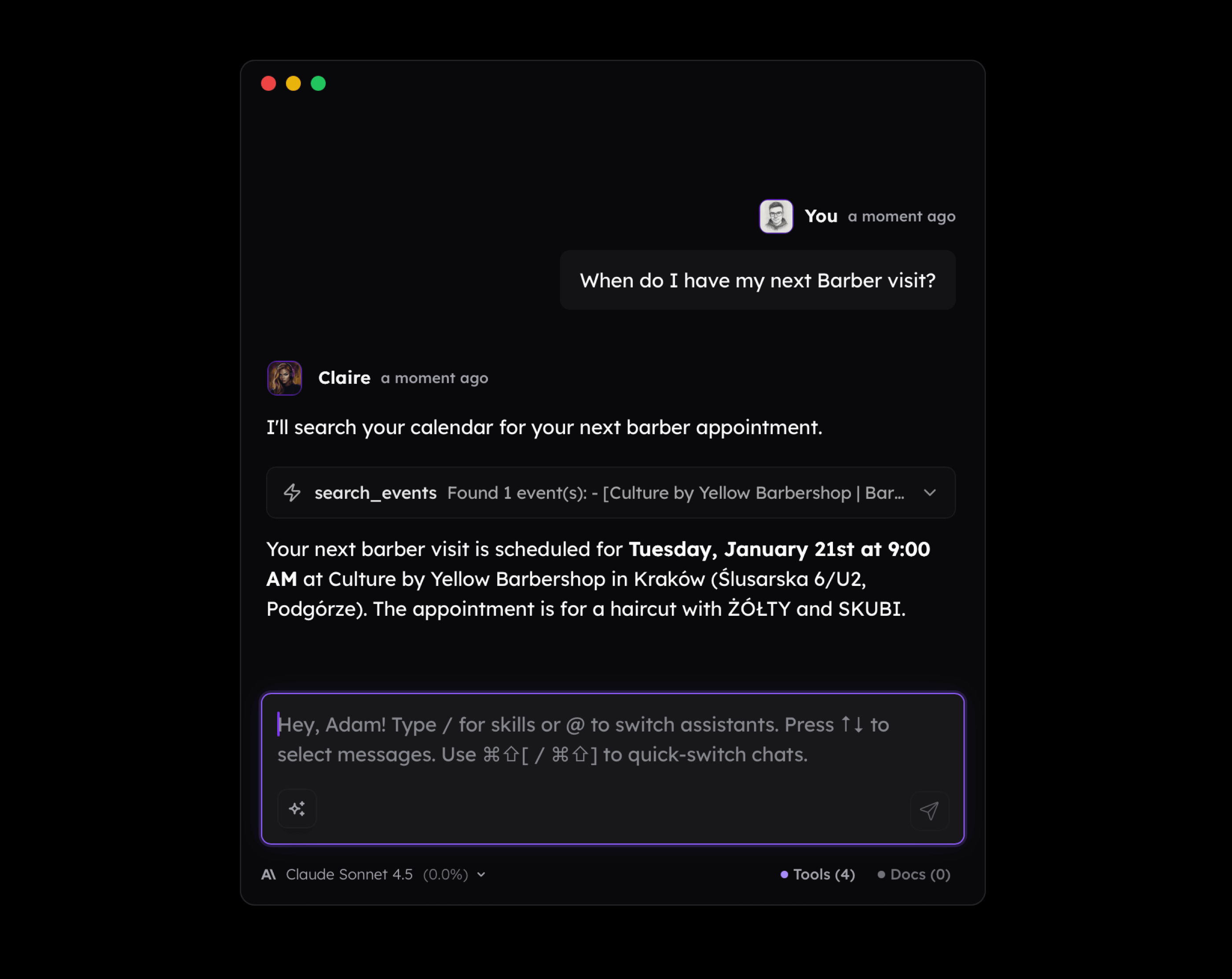 - A second query that makes the assistant generate an answer based on the tool's response