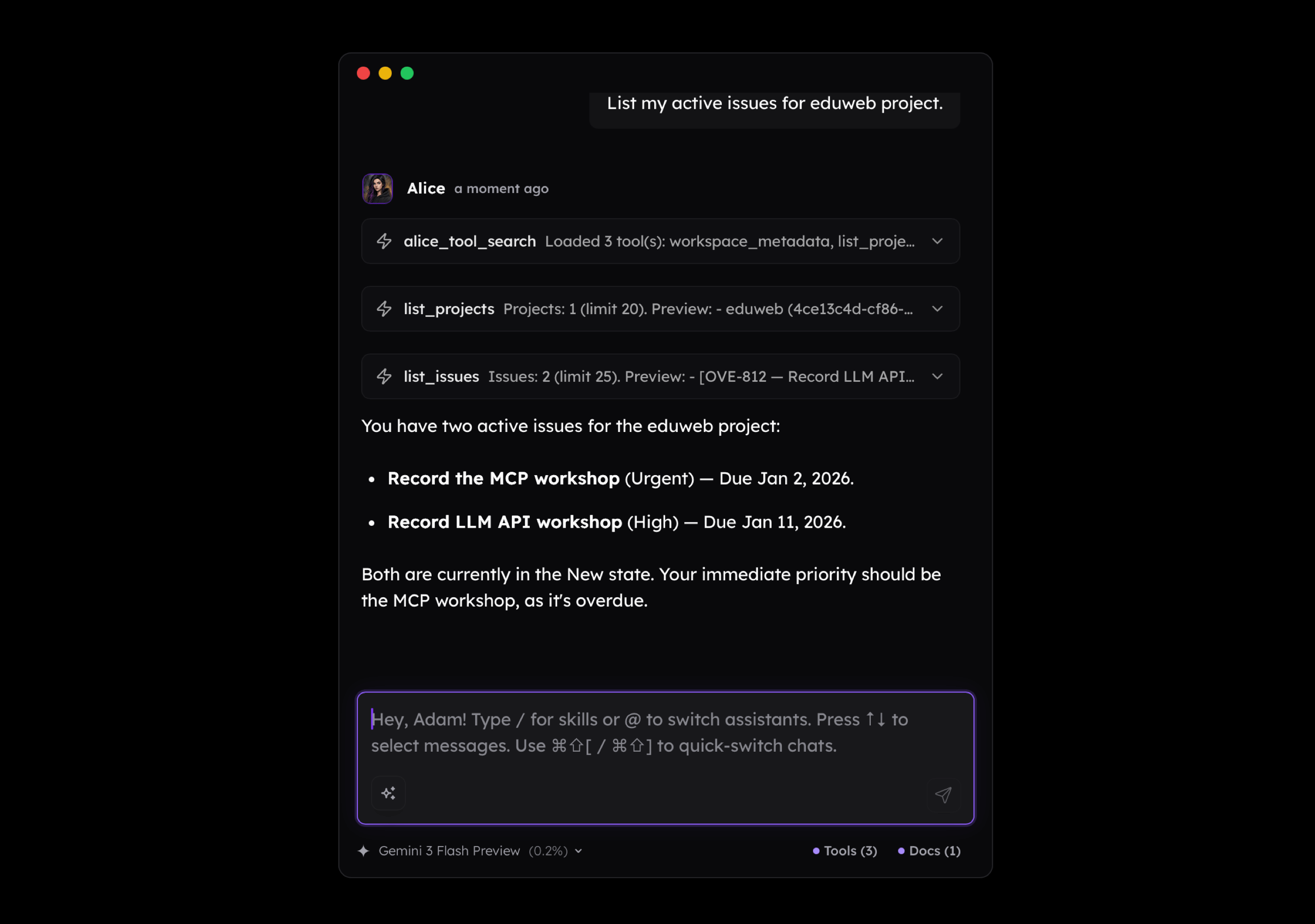 alice_tool_searchwas called to find the tools needed to fulfill the user's request. In such a case, we are talking about "progressive disclosure". This tool is extremely useful because, as I mentioned before, you would normally need to load all the tools assigned to a given agent. In my case, Alice has over 20 tools assigned; instead of loading their definitions into the context regardless of whether they are needed, the agent retrieves them only when it actually needs them. A concept of this tool comes from Anthropic and based on my own experience it works very well in practice.