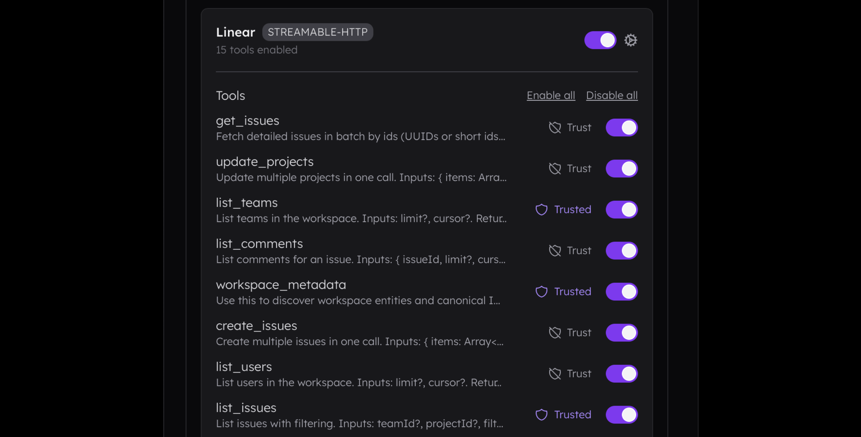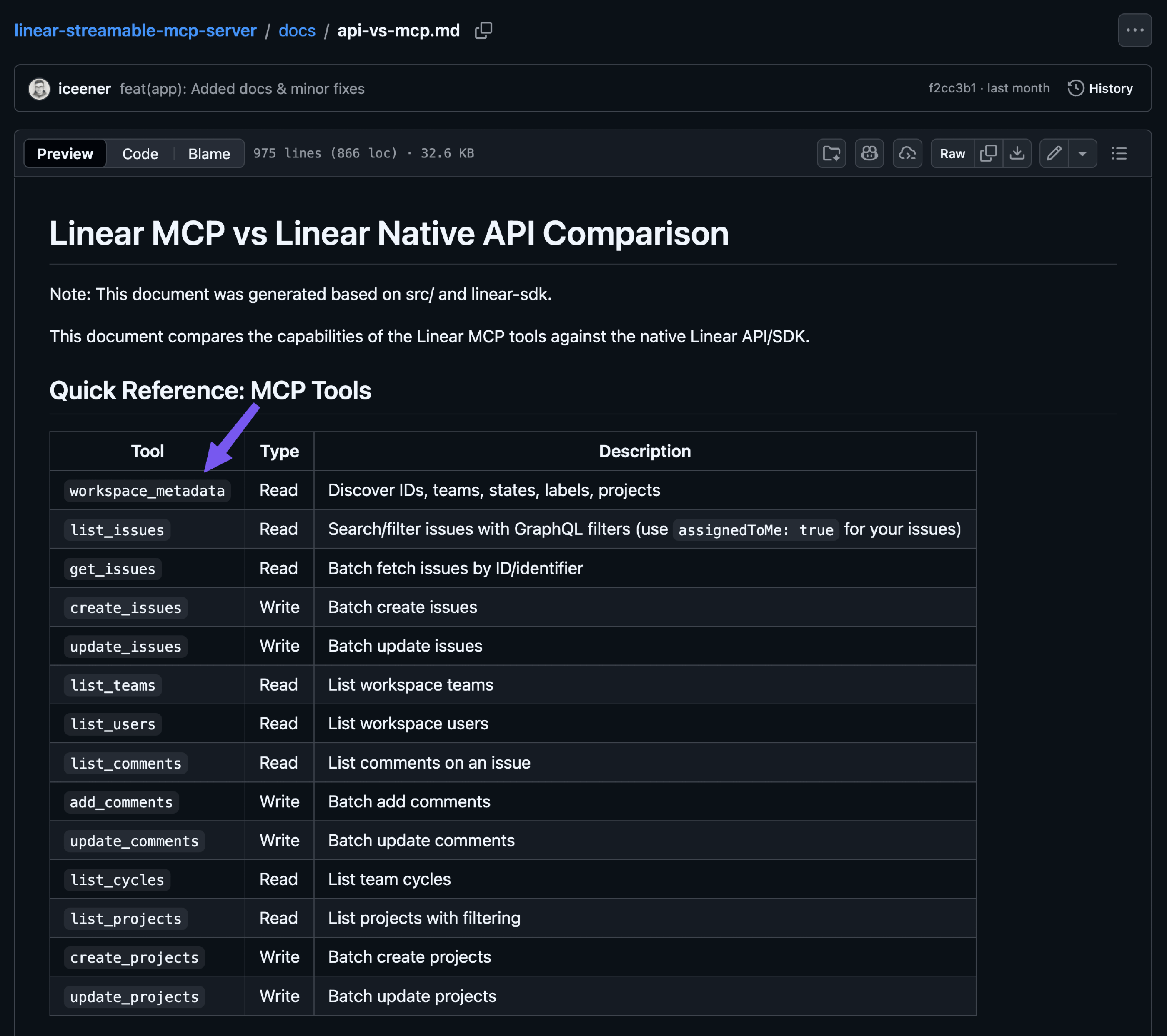 workspace_metadatashown below, so I created this tool to consolidate the identifiers for teams, states, labels, users, and projects into a single endpoint. This way, I reduced the context needed to expose all these tools and decreased the number of tokens returned because the LLM can decide which identifiers to fetch.