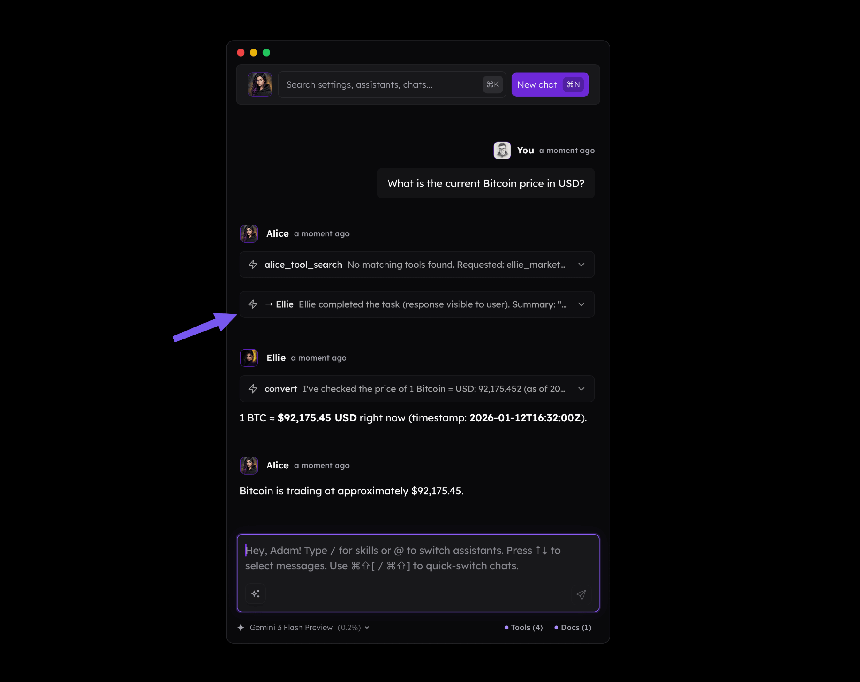Below, we can see how the agent "Ellie" was assigned a task by another agent, "Alice," to check the current Bitcoin price. The tool associated with the crypto market was assigned to "Ellie" in this instance. Such an interaction provides much better control over the context because the main thread contains only the result returned by "Ellie," without her system prompt, tool definitions, or the full tool results.