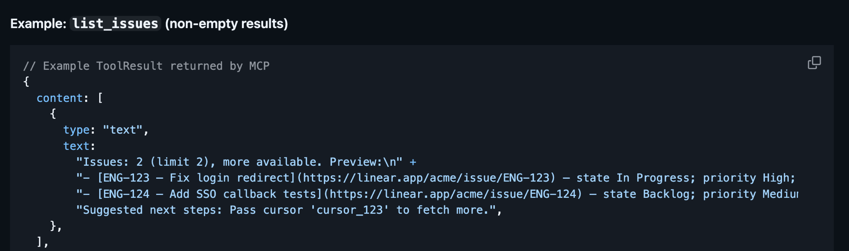 - Finally, we have one more extremely important tip for designing tools. Both success and error responses should contain not only the result data but also a helpful tip that the agent can use to understand the next steps. For example, in the Linear MCP, I designed the