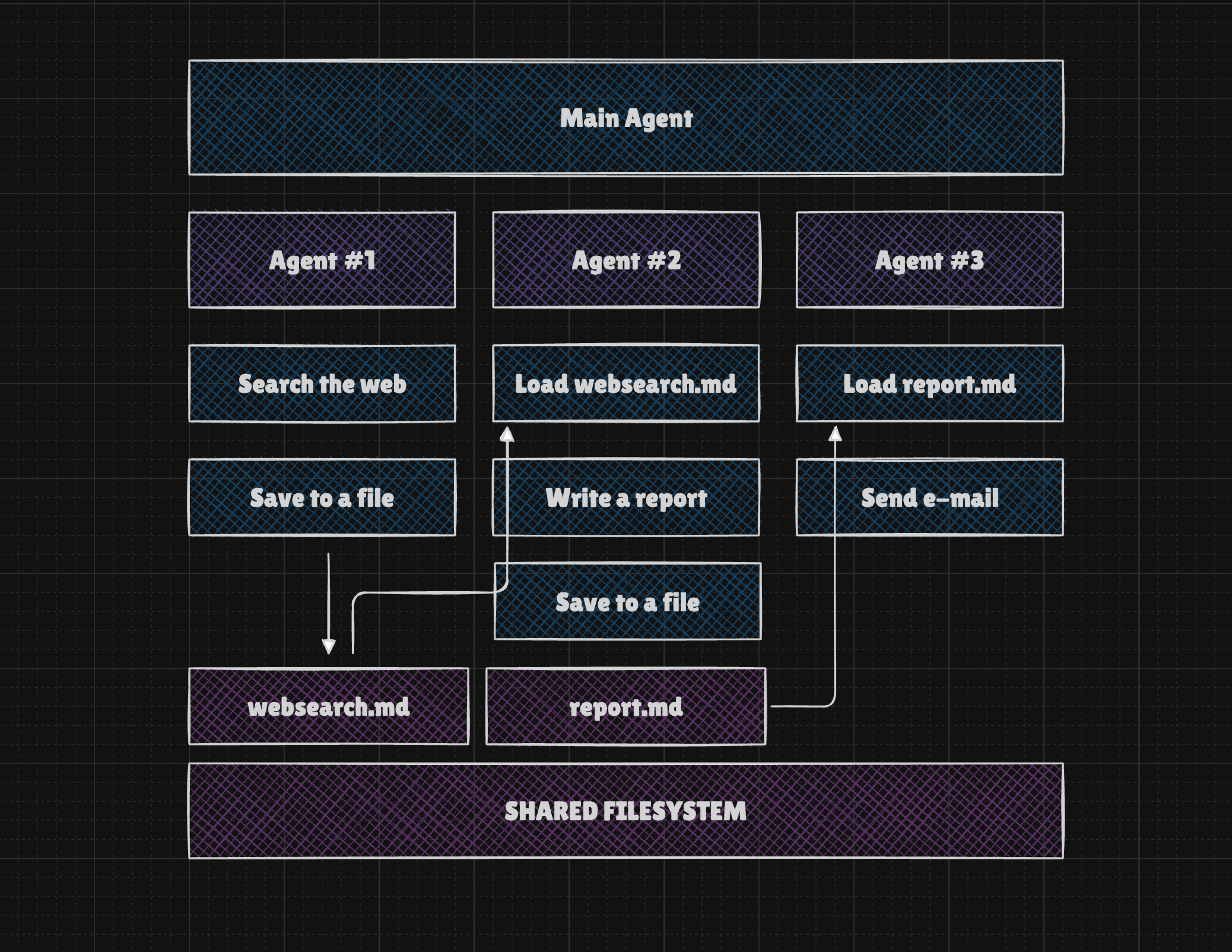 searching the web,writing a report, andsending an email, we find that the first tool's result must be rewritten by an LLM for the second tool, and that tool's result rewritten again for the third. This makes our agent slow and expensive. Instead, we can use a filesystem so agents can save tool results and pass a file reference rather than rewriting data multiple times.