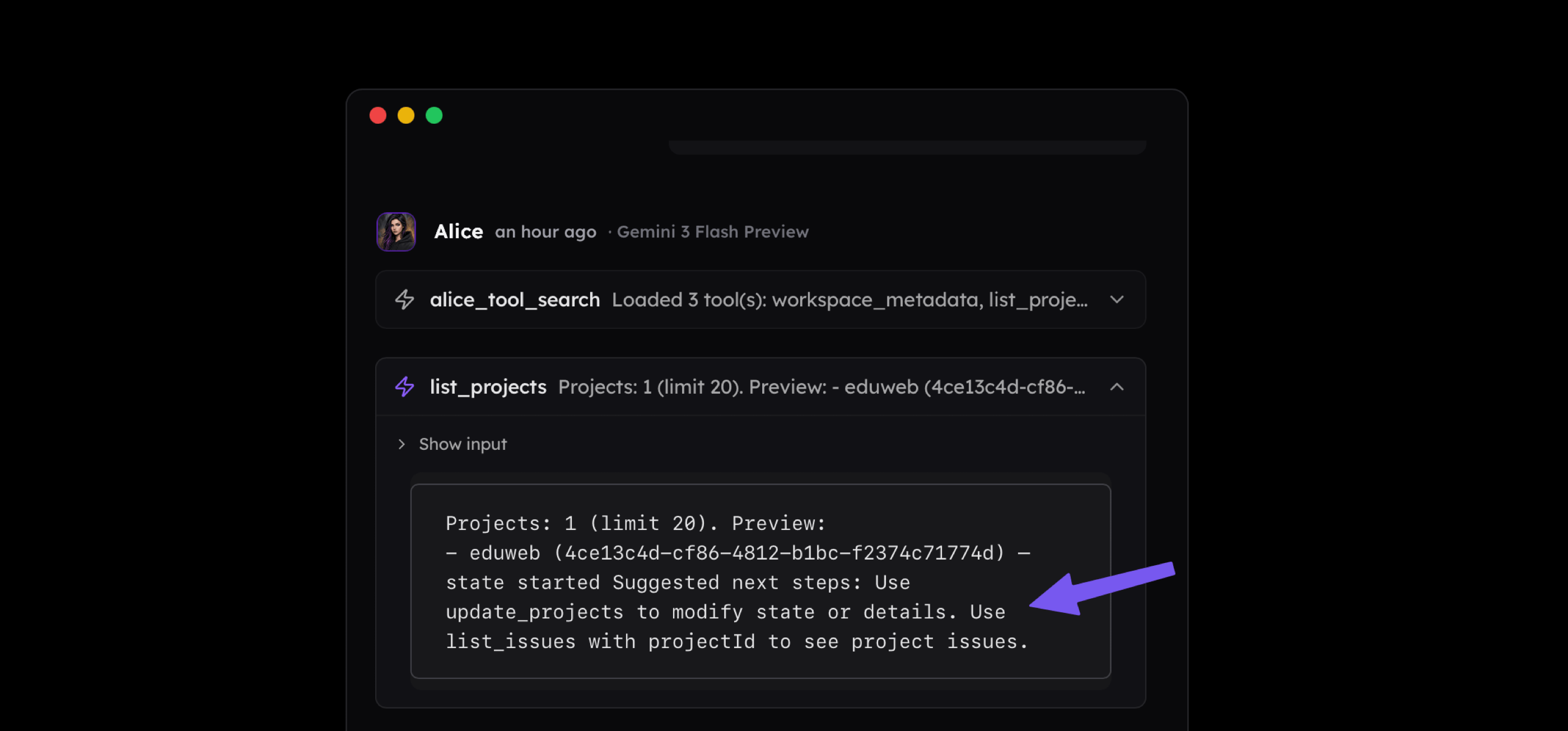 list_projectstool to return its name and identifier along with a tip explaining that the ID can be used with another tool. We must be careful with such tips, however. If a suggested tool is not available to the agent, providing these hints may hinder performance rather than support it. The goal is simple here to reduce noise to signal ratio to the minimum.